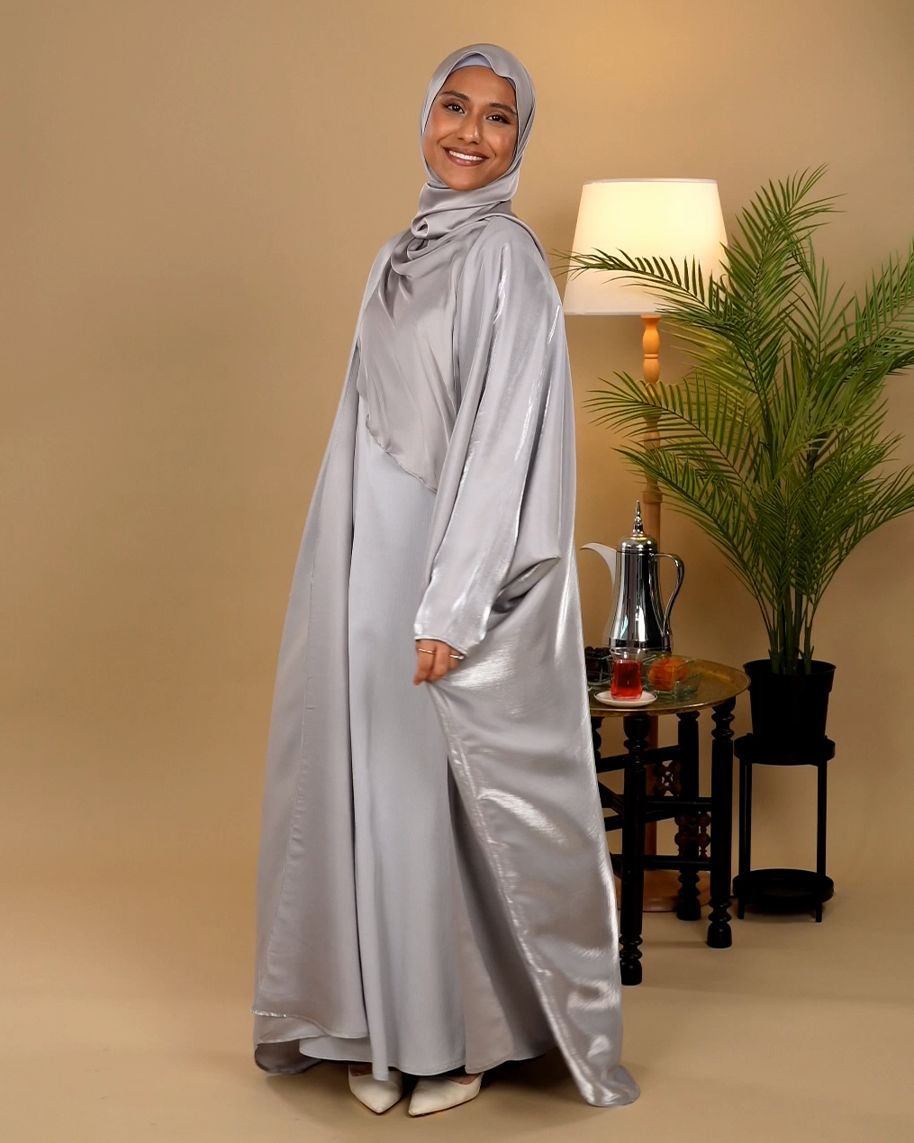 Glimmer Satin Open Front Abaya - Silver