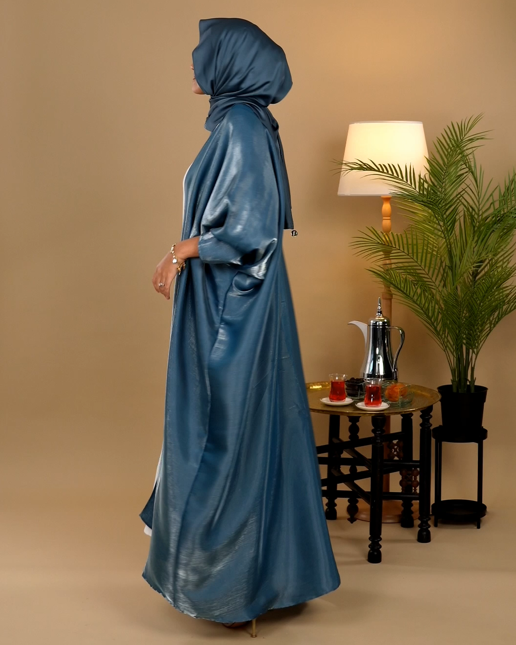 Glimmer Satin Open Front Abaya - Aegean Blue