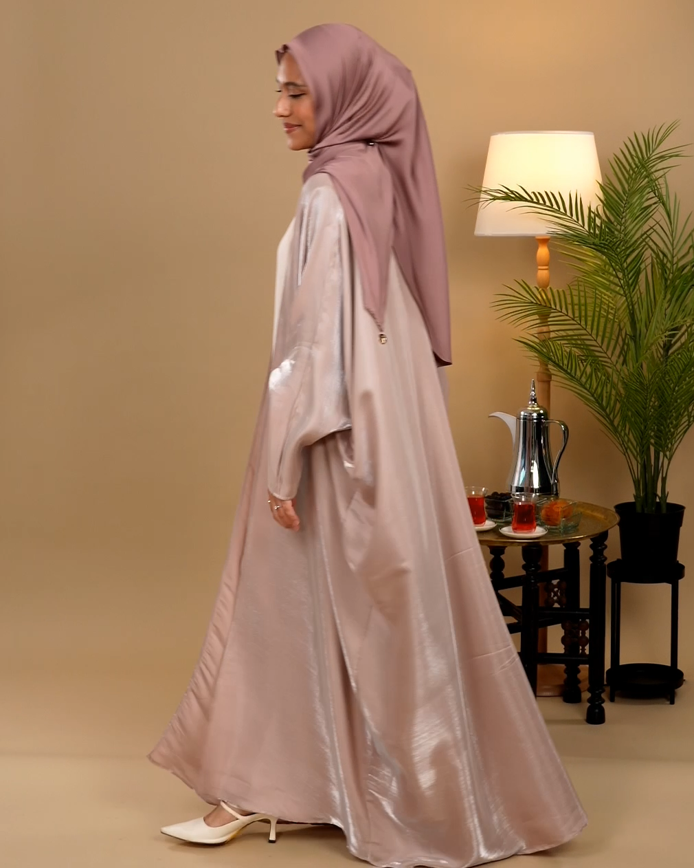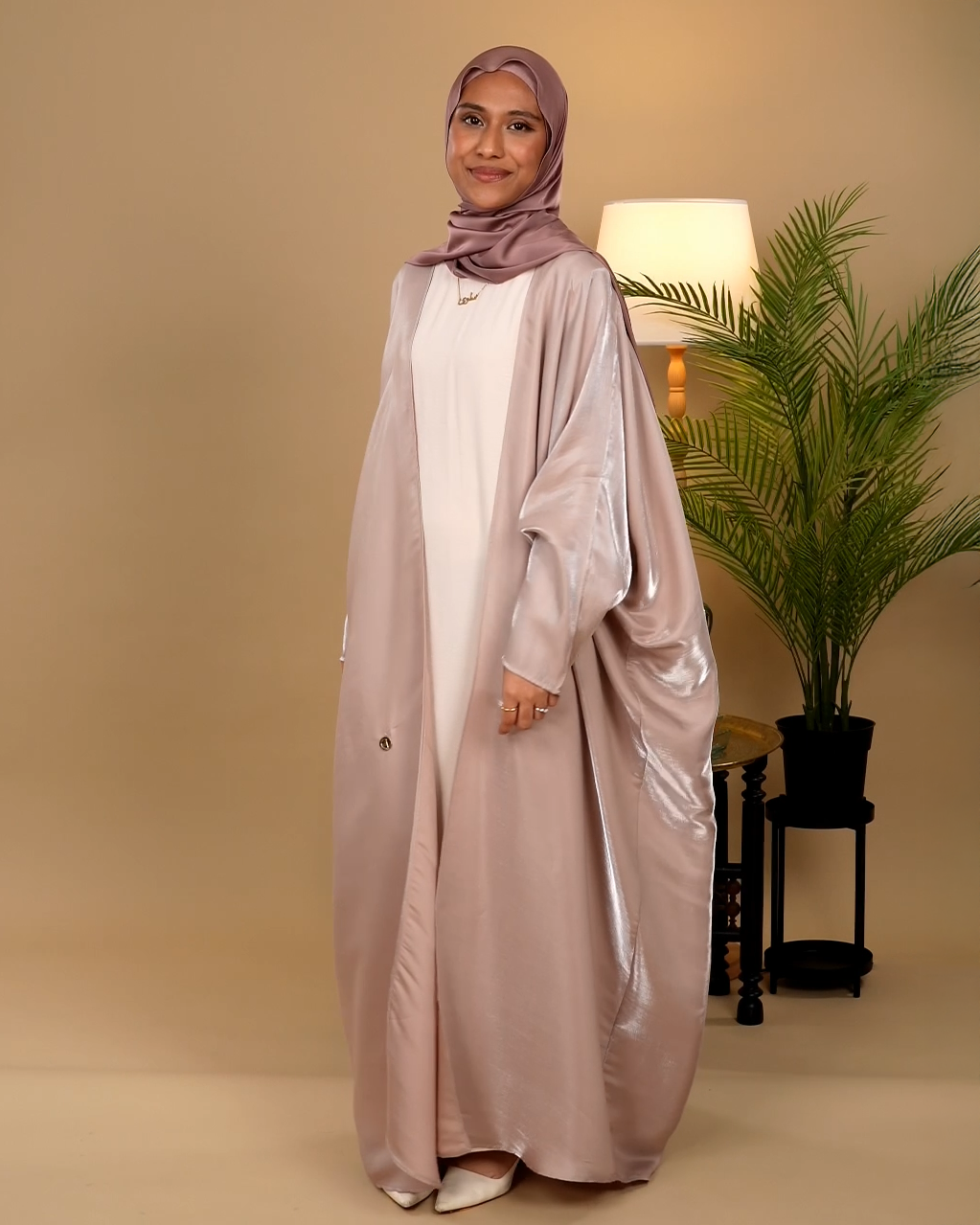 Crafted from premium lightweight satin, this open front abaya delivers an elegant silhouette with a refined, lustrous finish. The fabric's fluid drape and gentle sheen create an effortlessly sophisticated look, perfect for those seeking understated luxury in their modest wear collection.