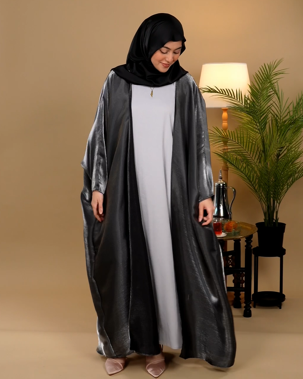 Glimmer Satin Open Front Abaya - Dark Platinum