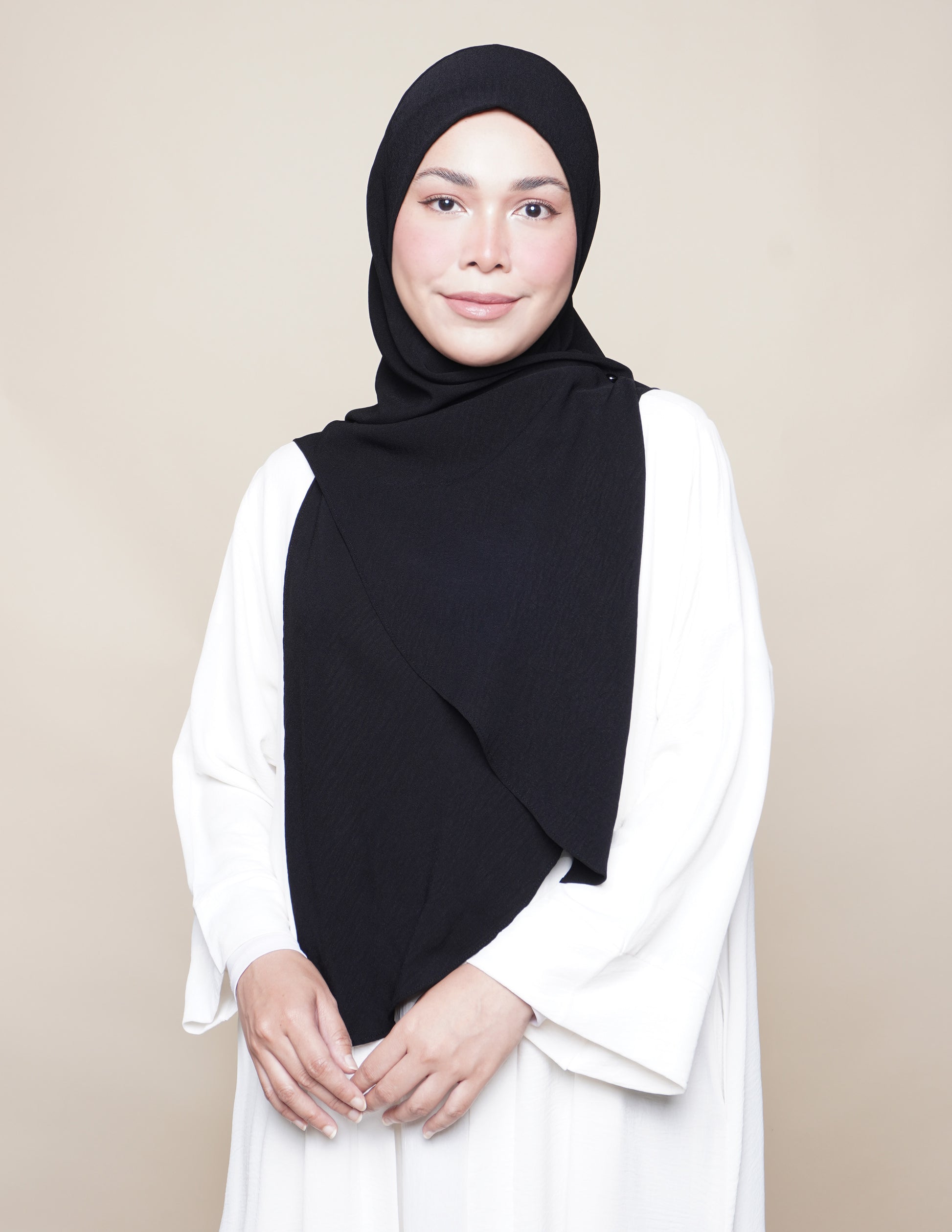 Discover the Iman, your go-to bawal-inspired shawl that effortlessly combines style with practicality. This semi-instant design delivers complete front and back coverage, making it perfect for any occasion. Crafted from luxuriously soft crepe fabric, it's virtually wrinkle-resistant, so you can look polished without the hassle of ironing. Experience the comfort and convenience that discerning customers love.